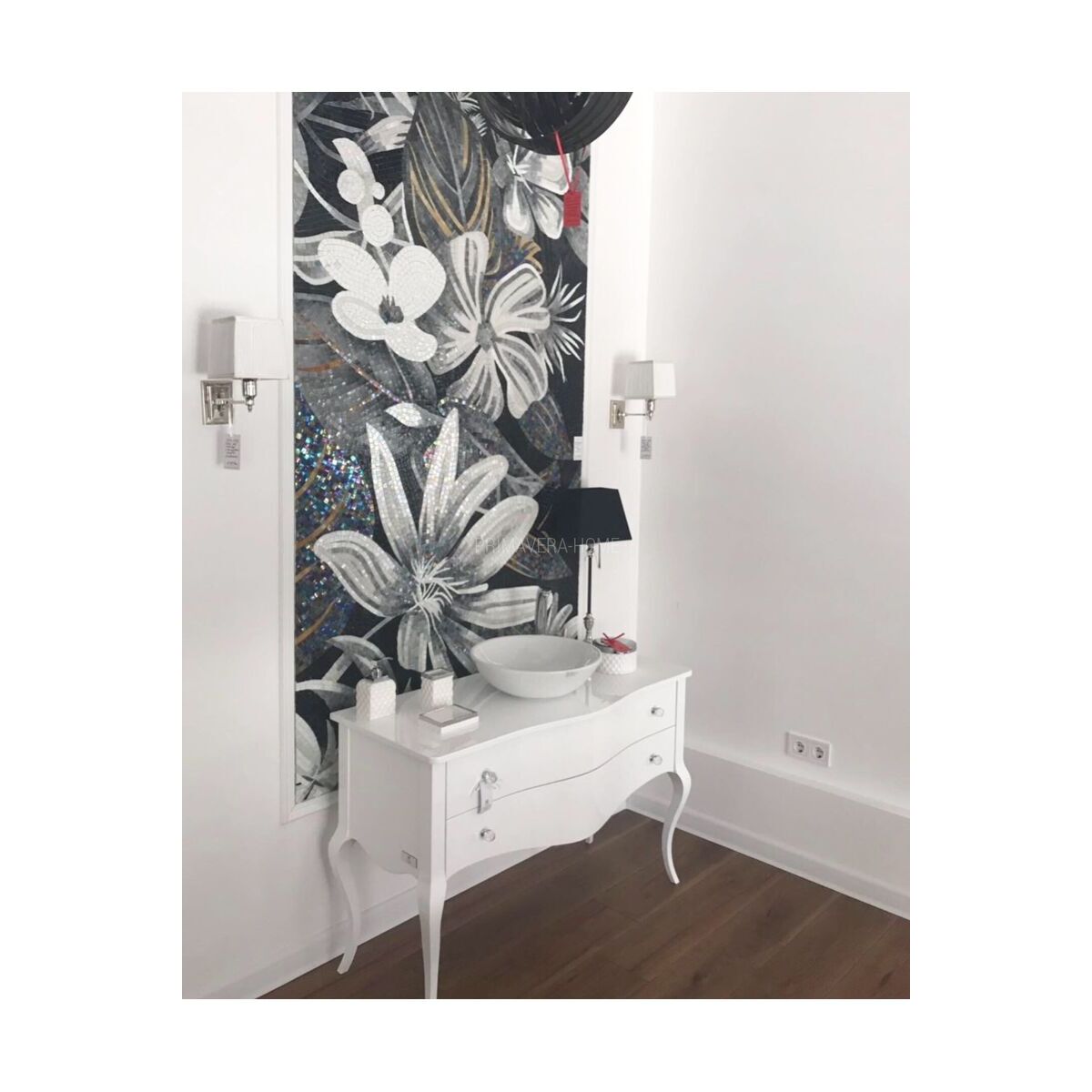 The fancy in its shape glamour bathroom chest of drawers ELIZABETH is an elegant and chic piece of furniture for a sink. It is a product of solid wood with the addition of MDF elements. The whole thing is painted white with beautiful gloss varnish. The chest of drawers is supported on high, decoratively curved legs and is equipped with two practical drawers. It is complemented by decorative, crystal knobs, adding a discreet chic. This stunning chest of drawers will work in a glamorous bathroom.