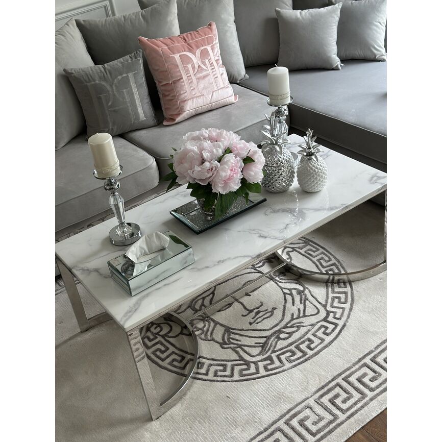 Stolik kawowy LOLA w kolorze srebrnym prezentuje się bardzo nowocześnie. Stolik ma długość 120 cm, szerokość 60 cm, co czyni go odpowiednim rozmiarem zarówno do małych, jak i większych przestrzeni. Jego prosty, minimalistyczny design sprawia, że pasuje do wielu różnych stylów wnętrz, takich jak nowoczesne, glamour czy loftowe.