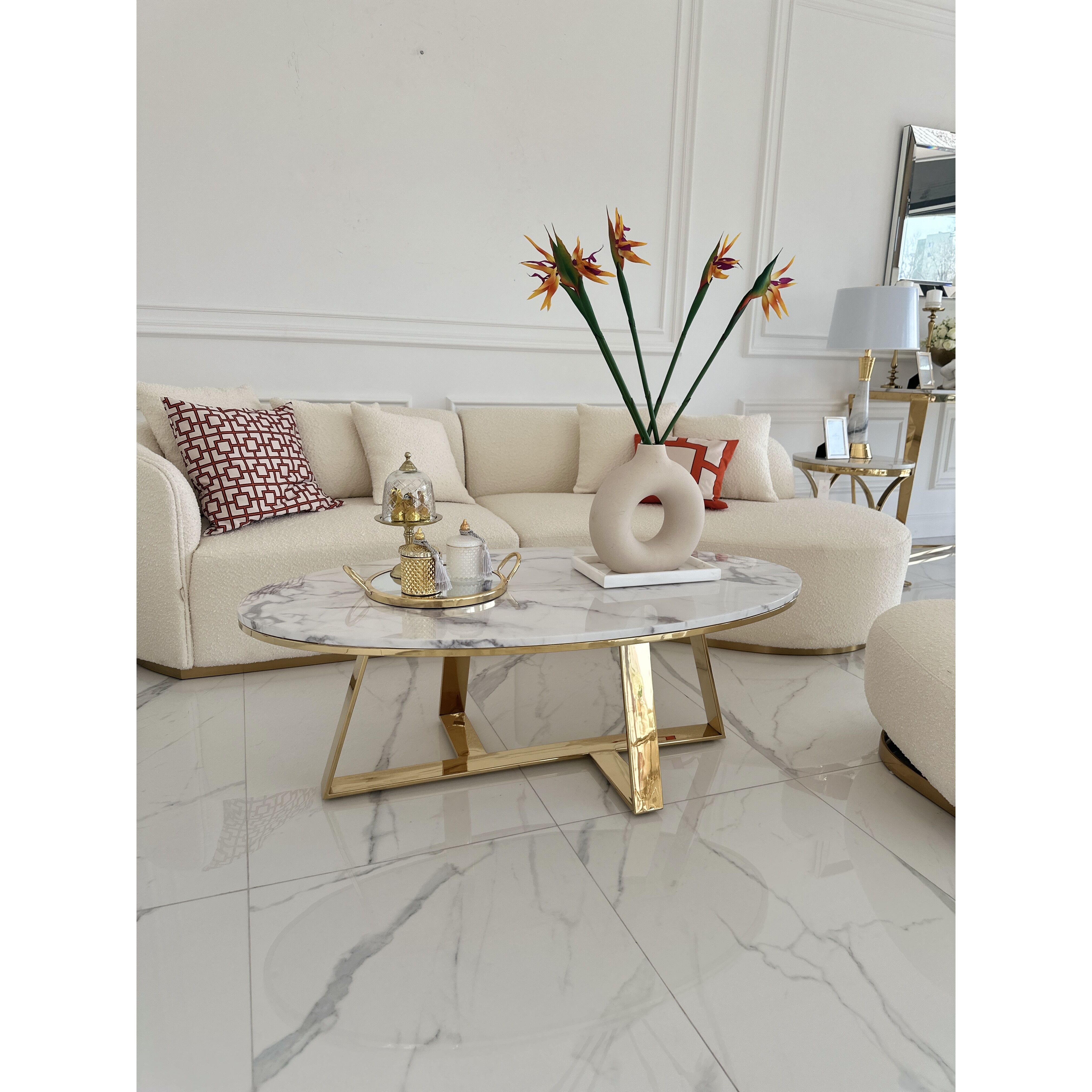 The NORMAN oval coffee table is an elegant and stylish addition to the living room or other room. This unique table has an oval form, which gives it a unique look, and the golden color of the steel gives it a luxurious character.