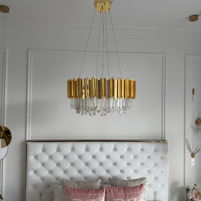 The chandelier perfectly emphasises the advantages of other products from the Primavera Home collection. For the living room we recommend our exclusive, comfortable and luxurious sofas from the EMPORIO, AVIATOR, MADONNA and MONTE CARLO collections. They are available in grey, beige and black and are decorated with gold elements. Depending on the model chosen it is possible to add a function of unfolding the sofa into a bed. Thanks to this it may turn out to be a piece of furniture perfectly suited to a small space, where functionality counts, as it will serve as a seat for guests during the day, and become a comfortable bed at night. When it comes to arranging the bedroom, we recommend our spacious and unusual POSH, SOHO and SPECTRE beds. Next to the bed you can place a bedside table from the CHICAGO GOLD or Lorenzo series. For additional lighting in the room we recommend elegant wall lamps also from the EMPIRE GOLD collection, thus perfectly matching the above chandelier.