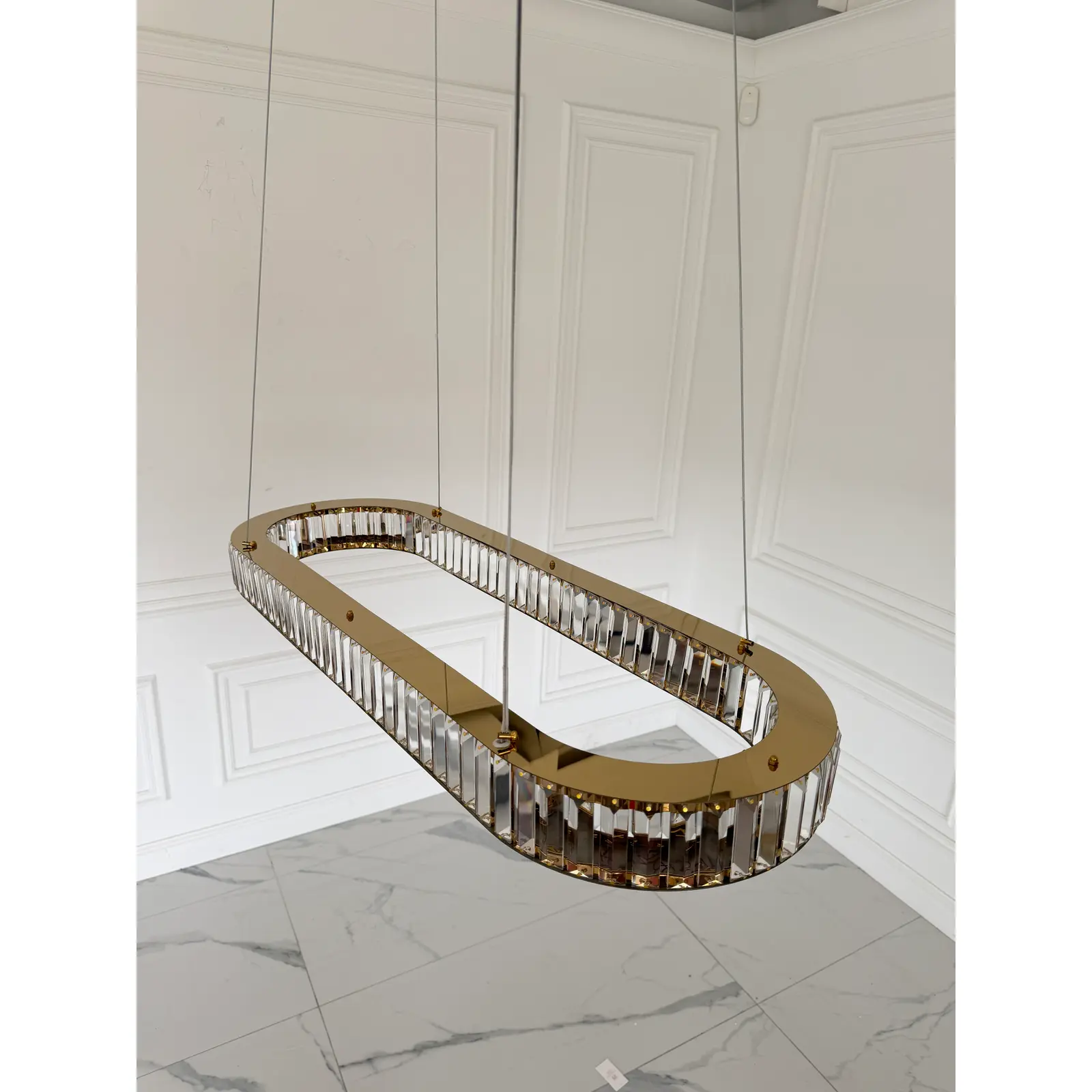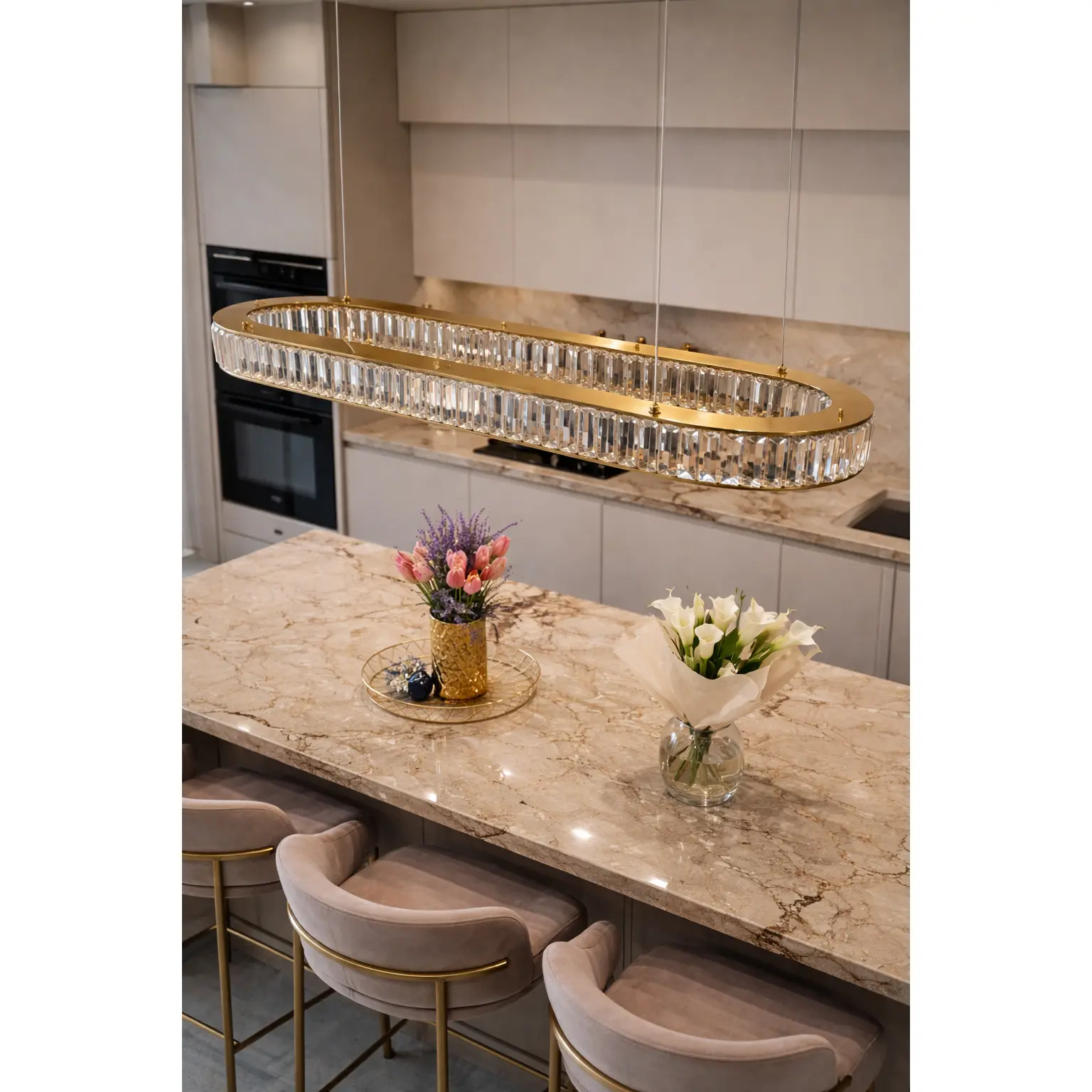 The ECLIPSE crystal chandelier is the perfect solution if you are looking for a hanging lamp with a modern and glamorous design for your living room. This chandelier is adjustable in height, which allows you to adapt it to individual preferences and needs. ECLIPSE is made of high-quality materials, including gold, which adds elegance and a luxurious look. The crystals that decorate this chandelier add shine and give the living room interior a unique character. Its size makes this chandelier suitable for rooms of various sizes, both smaller and larger. It can be combined with other lighting in the same style, or used alone as a central point of the living room arrangement. Thanks to its modern look, the ECLIPSE chandelier will add exclusivity and sophistication to your living room, creating a pleasant and stylish atmosphere.