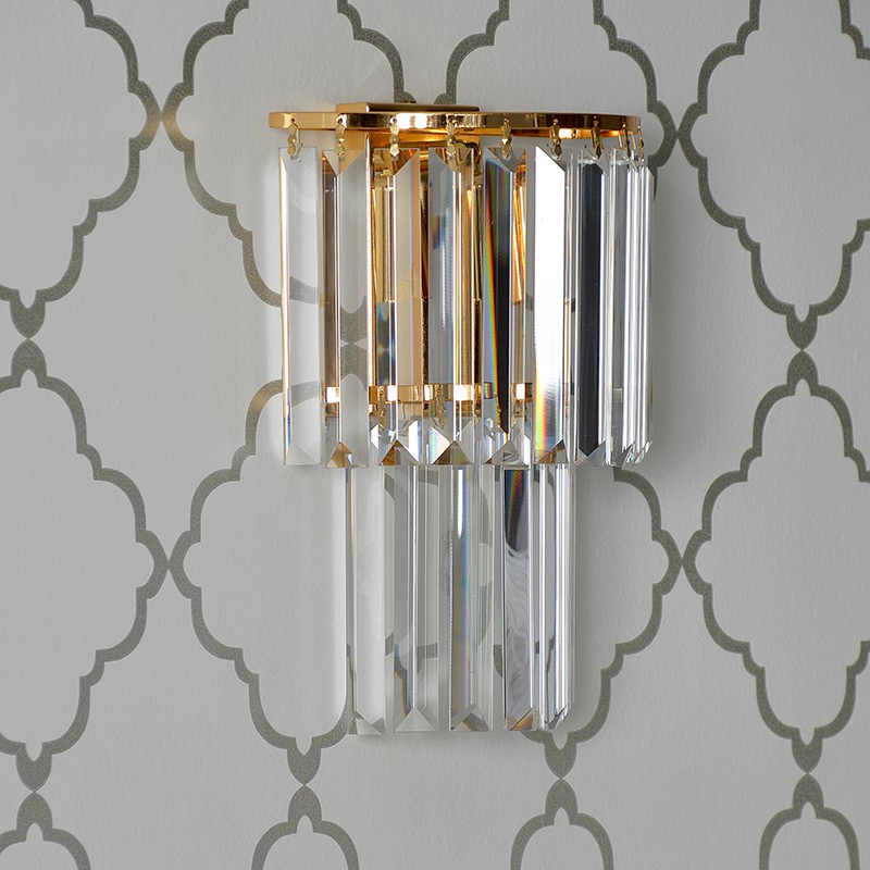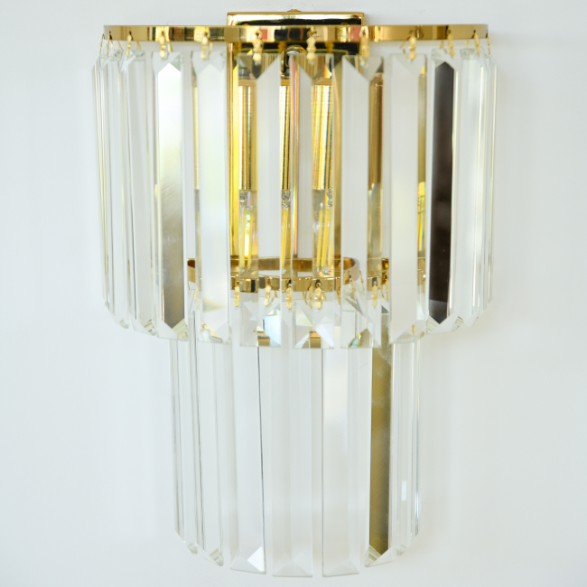 The XS GOLD crystal glamour wall lamp is the quintessence of the New York style, full of elegance and taste. Its metal base in the colour of gold has a semicircle shape. It is surrounded by long and slender crystals hanging on two levels, which create spectacular light reflections. This beautiful combination of noble materials, gives a cosy, warm light with amazing brilliance. Chic and elegant wall lamp will perfectly complement the decor of a living room, bedroom or hallway. Interiors maintained in glamour style look great when illuminated with a large number of lamps or chandeliers. The small size (31x23 cm) gold wall lamp made of crystal glass is a perfect supplement of the main source of light in a room. It is powered by a single bulb (40W E14), thanks to which it can play the role of a subtle lighting, which will give a cosy character to any room.