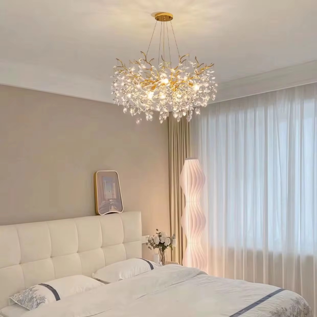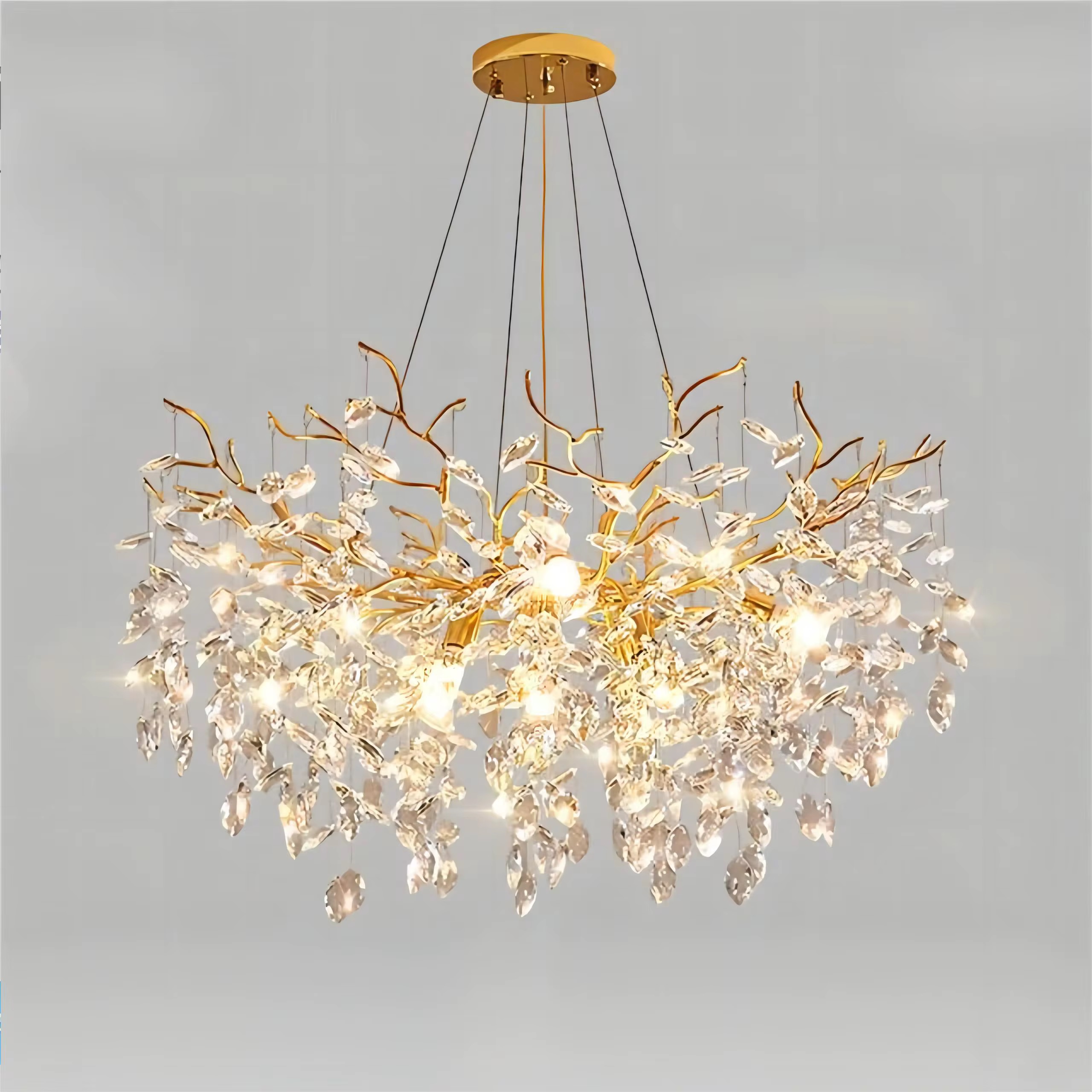 Bring pure luxury into your home with the QUEEN gold crystal chandelier. This extraordinary designer pendant lamp is a true work of art, its form referencing the organic shapes of nature and interpreting them in an extremely elegant and modern way. Dozens of precisely arranged glass crystals, set on a shiny gold structure, create spectacular illumination, reminiscent of a cascade of precious crystals.