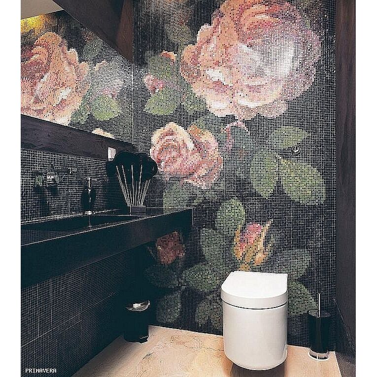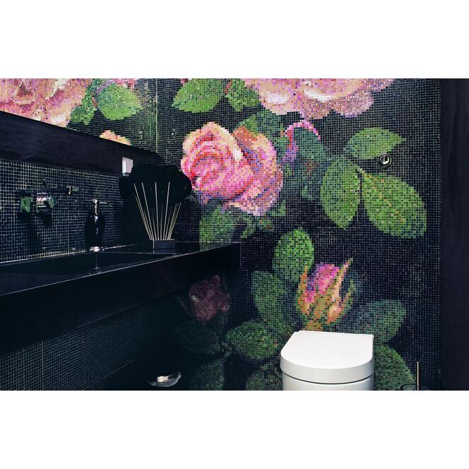 The picture of the glass mosaic is made by hand in art studios. The small cubes create an amazing effect on walls and floors. The mosaic is universal when it comes to its application. The mosaic can be used both indoors and outdoors e.g.: on the floor, on the wall, in the swimming pool, living room, sauna or steam bath. The glass mosaic painting has a great potential for color, you can make stunning compositions from it. Springrose Nero is a pattern from a series of decori, glass mosaic. Decori 10 is a series of glass mosaics in which the patterns are composed of cubes in size 10x10mm, can be modular or single. Springrose nero is a modular pattern in size 129.1 x 290.5 cm, consists of two parts A and B joining together. The composition is made of cubes from the 'colors 10' series, and these are lines: gm' - la gemme, different colored strands of drawn glass in the structure of the cubes, the cubes are arranged on a slice randomly, (it is the direction of the glass streaks); 'gl' - glossy, smooth surface and uniform glossy color; 'sm' - smalto, visible strands of drawn glass in the structure of the cubes, the cubes are arranged on a slice randomly, (it is the direction of the glass streaks);vtc' - vetricolor, uniform color and refraction of the incident light; 'vtc plus' - vetricolor plus, compromise 'vtc' and 'gm', i.e. delicate clearances of streaks of drawn glass in the uniform mass of the cube; the SPRINGROSE pattern is formed by lines : vtc, gm. Springrose nero pattern (A or B) covers 3.73 m2 and consists of 36 slices, cubes on each slice are glued on paper, the front to it, all slices are numbered to facilitate laying. If you are interested in purchasing a mosaic, please contact us by e-mail to determine the cost of transport and delivery time.