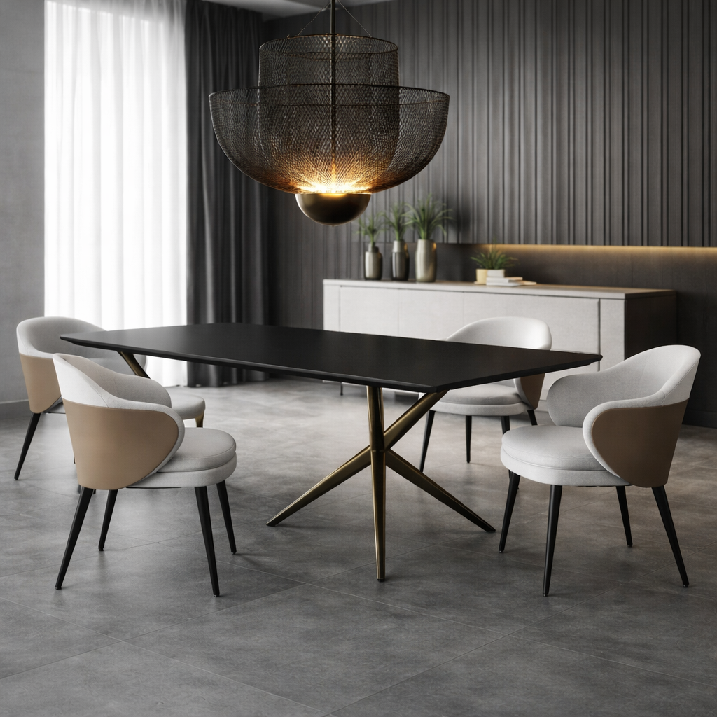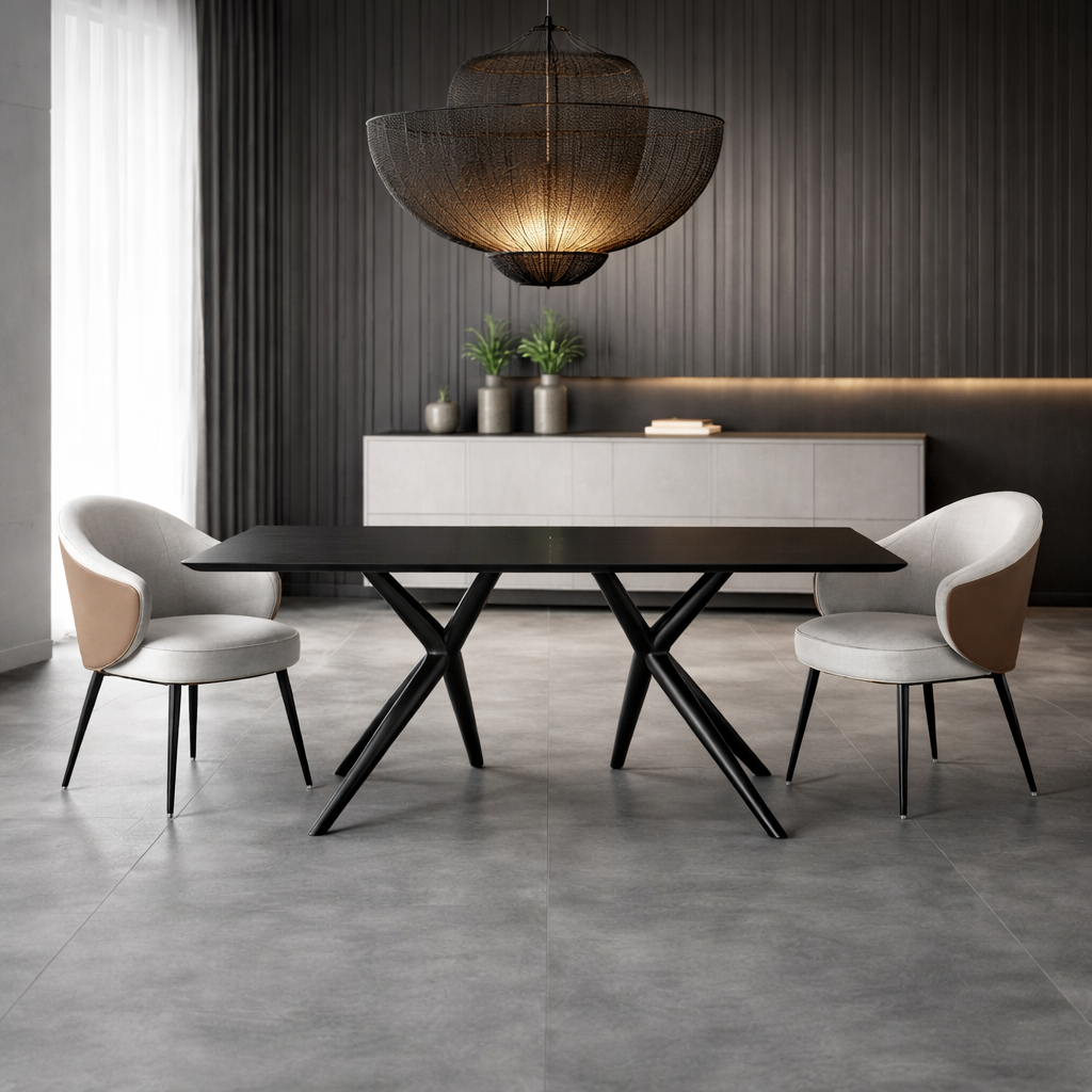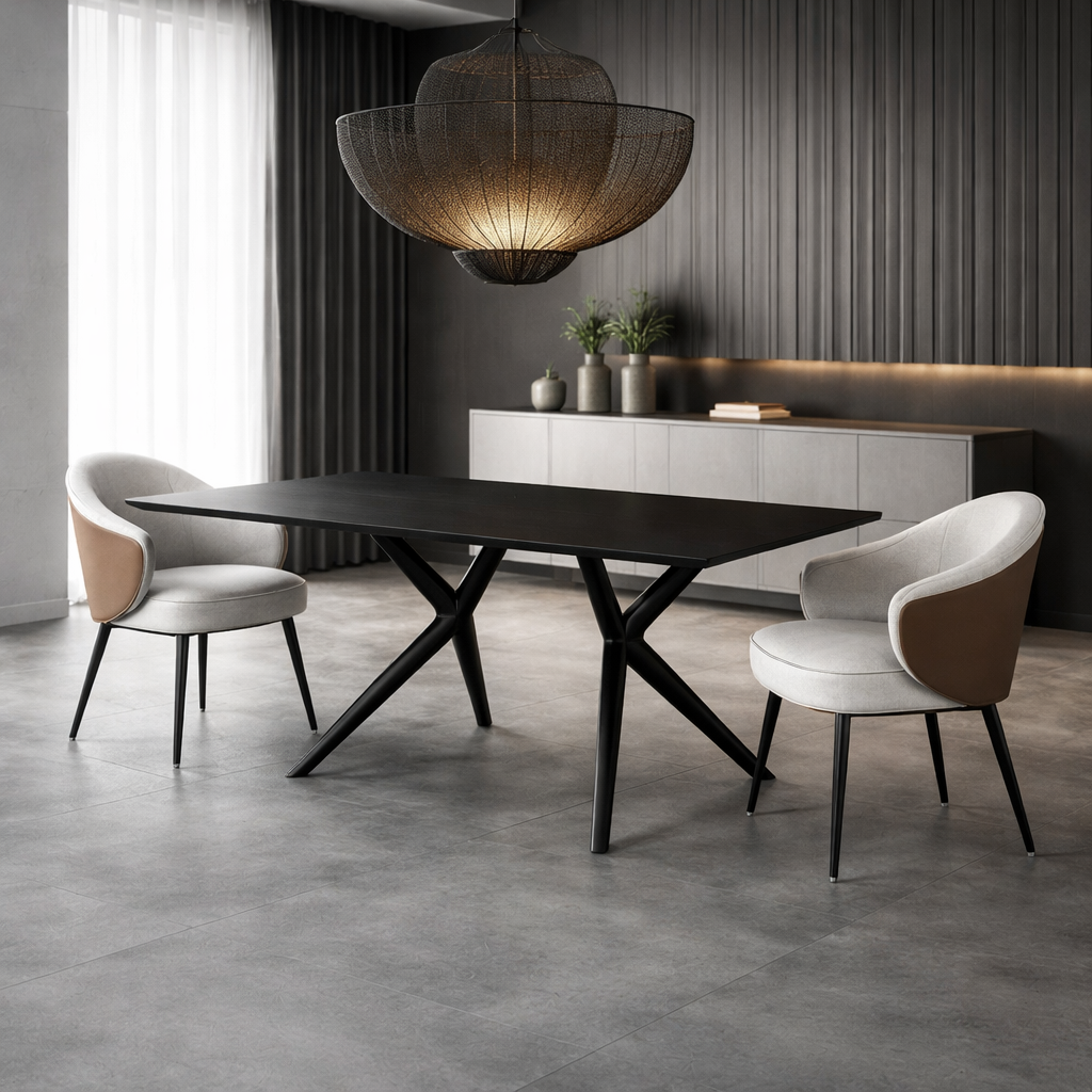 Geometryczne, metalowe nogi w kształcie litery X podkreślają minimalistyczny charakter stołu, zapewniając jednocześnie stabilność i wytrzymałość. Idealnie sprawdzi się w nowoczesnych jadalniach, loftach oraz eleganckich przestrzeniach biurowych.