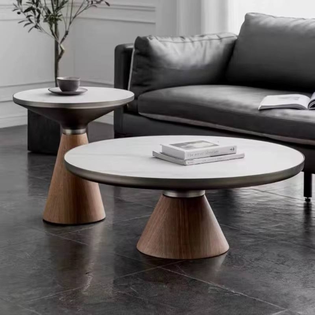 Stolik kawowy ROBIN L z drewna, spiekanego kamienia PATAGONIA i detali w szczotkowanym złocie – średnica 80 × 45 cm