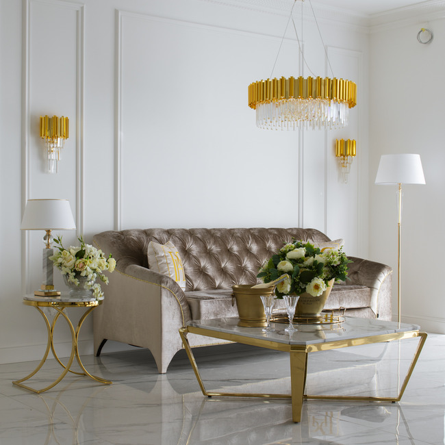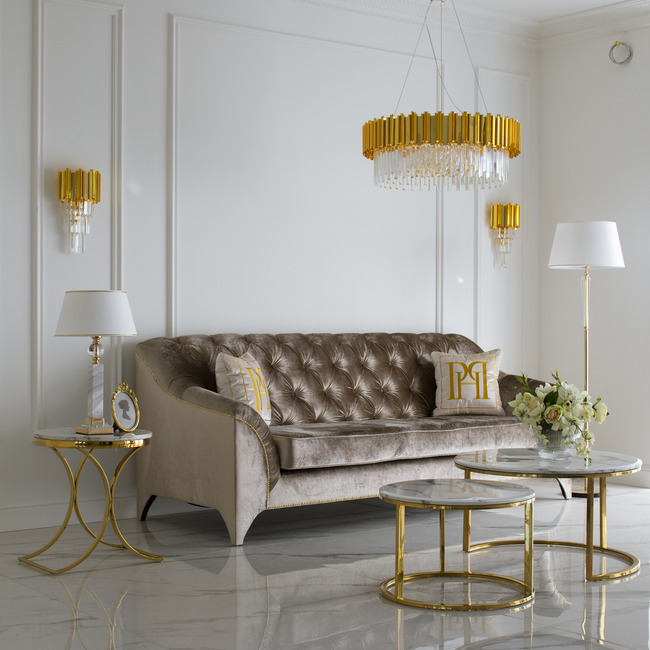 The quilted PRADA sofa in a modern style goes perfectly with other furniture and accessories from the Primavera collection. A beautifully decorated living room is characterized primarily by attention to detail. A sophisticated arrangement will be more visible thanks to appropriate lighting. The chandelier and wall lamps from the EMPIRE GOLD series with gold decorations and shiny crystal icicles will be perfect for this purpose. However, during quiet evenings with a book or your favorite movie, the MARMO table lamp with its soft, warm light will work well. You should also remember about the functional and breathtaking RALPH coffee table. Together with the PRADA sofa, they will be your favorite place to relax and socialize. You can place a bouquet of flowers or elegant candlesticks on it.