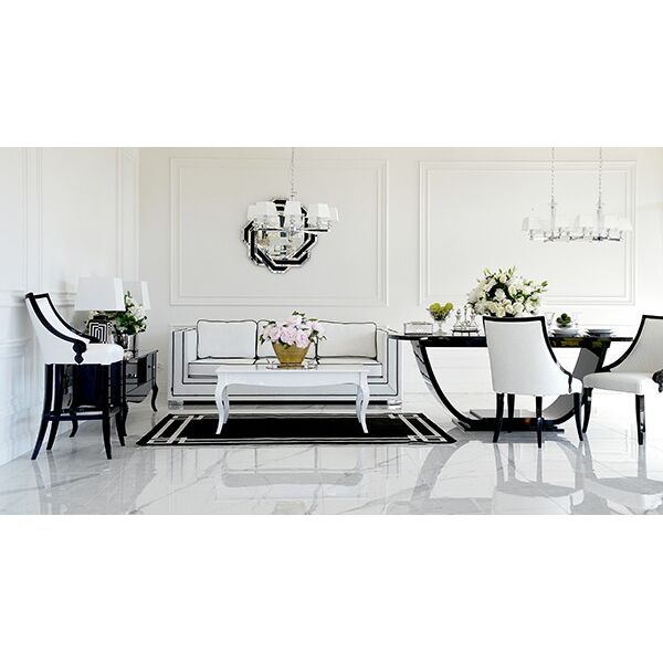 As an elegant and sophisticated piece of furniture, the BIANKA sofa deserves to be accompanied only by the highest quality accessories and other products from the Primavera Home collection. Thanks to its modern design it does not take long to match it with glamour elements. We recommend the ELENA GLAMOUR coffee table for an extraordinary living room. Its dazzling gloss and durability are ensured by coating its surface with Italian lacquer. As with the sofa, its size can be modified to suit the buyer's preferences and needs. New York CLASSIC BLACK carpet will bring additional warmth and cosiness to the interior. The DUNE BLACK SILVER round mirror will give an interesting and unconventional futuristic touch. We also recommend the ELEGANZA M SILVER chandelier so that you can enjoy the beauty of the design even late in the day.