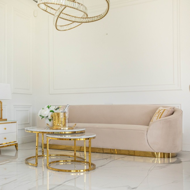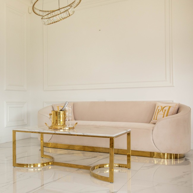 A modern and elegant sofa from the stunning FLORENCE collection is a unique piece of furniture that will fit wonderfully into any carefully designed interior. It will work particularly well in rooms decorated in a fashionable and sophisticated glamour style. Thanks to its well-thought-out dimensions (238 cm x 84 cm x 74 cm), it will perfectly complement the decor of not only large, spacious living rooms, but will also successfully serve as a luxurious and functional addition to slightly smaller rooms such as the interior of a fashionable boutique, showroom or exclusive hotel lobby. The FLORENCE sofa is a combination of top-class materials, precision workmanship and unique, carefully planned design. Attention is drawn to the velvet, pleasant to the touch fabric in a beautiful, incredibly elegant, beige color. The attention is also drawn to the exquisite finish of the furniture, which uses beautifully shiny, very tasteful elements in a classic, gold color. Thanks to its comfortable backrest and soft seat, which provides the right amount of elasticity, the FLORENCE sofa guarantees incredible seating comfort. It is a piece of furniture that will effectively emphasize the unique character of the room and bring the desired shine and a touch of true extravagance to it.