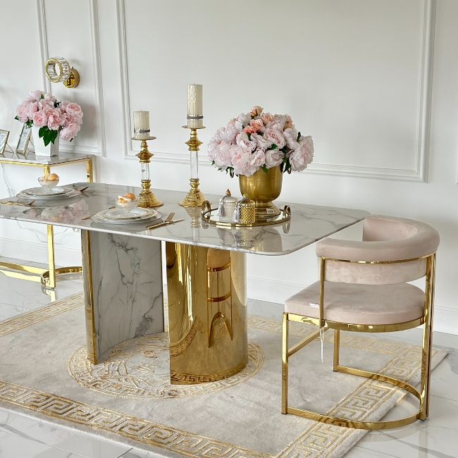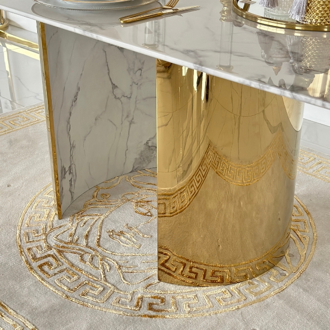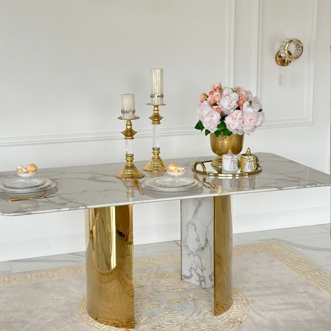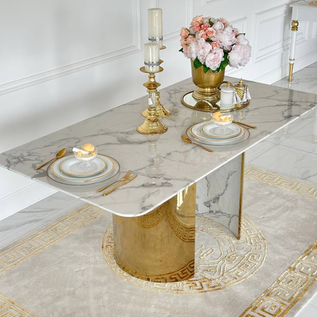 The table legs are made of gold-plated metal, which adds even more prestige and luxury to it. The combination of golden legs and white marble makes the MILANO table not only a functional dining room furniture, but also a designer decorative element that attracts attention and gives the room a luxurious look.