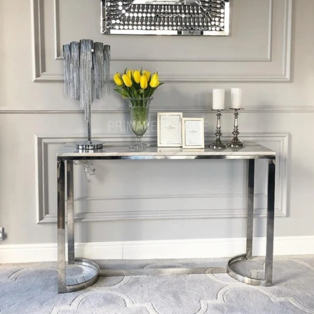 Gustowna srebrna konsola LOLA, to pełen wdzięku mebel, który sprawdzi się w przedpokoju lub w salonie, urządzonym w eleganckim stylu. Prosta i lekka w swojej formie podstawa ze stali szlachetnej, a osadzony na niej blat o pięknym połysku, wykonano z konglomeratu, imitującego jasny marmur. To wytworny mebel, zrobiony w całości ręcznie, dzięki czemu jest unikatowy. Subtelna w swoim charakterze konsola LOLA, z naszej kolekcji, to stylowe uzupełnienie każdego wysmakowanego wnętrza.