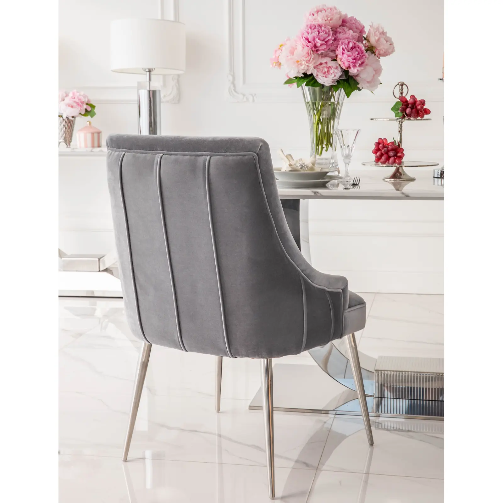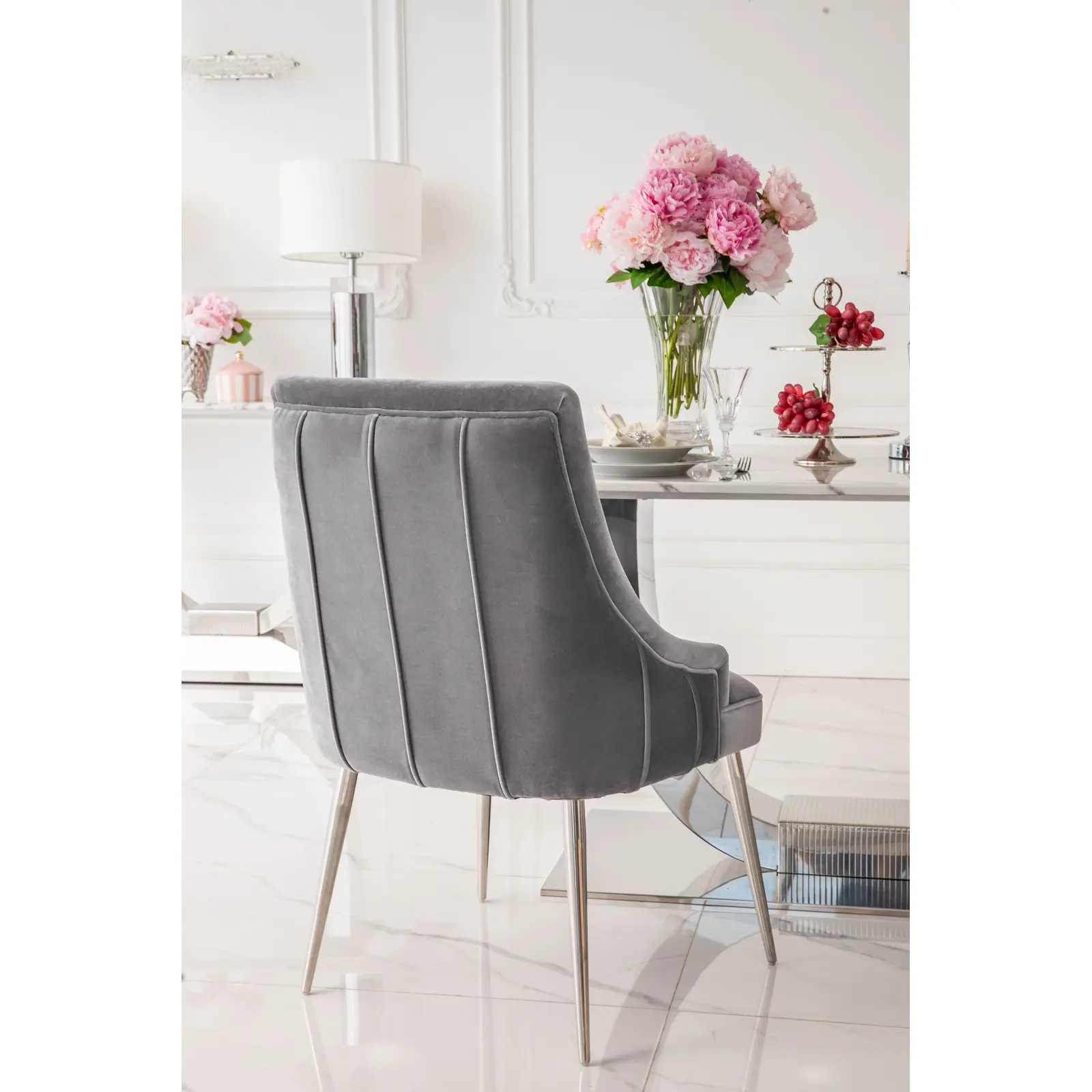 Krzesło DIANA wyróżnia się prostą, a jednocześnie efektowną formą, idealnie wpisującą się w styl glamour. Jego tapicerka w eleganckim szarym kolorze jest wykonana z wysokiej jakości, przyjemnej w dotyku tkaniny, która doskonale komponuje się z lśniącymi, srebrnymi, prostymi nogami ze stali nierdzewnej. Polerowane srebrne detale nadają krzesłu luksusowego charakteru i sprawiają, że staje się ono prawdziwą ozdobą wnętrza.