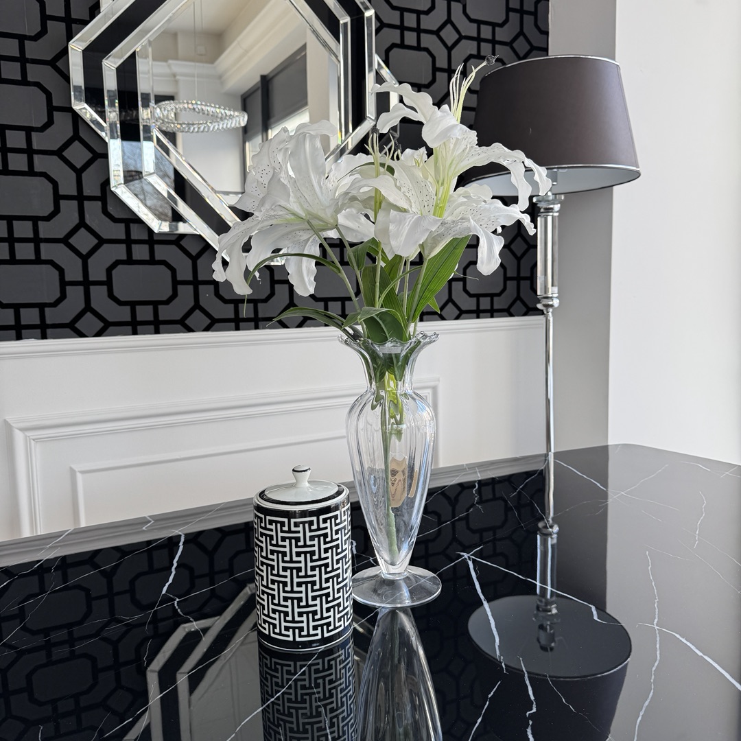 W szerokiej ofercie mebli marki Primavera Home z łatwością znajdziesz zestawy krzeseł, które swą elegancją i kunsztownym wykończeniem dorównają świetnemu designowi stołu KENT. W tej aranżacji rewelacyjnie odnajdą się pikowane krzesła na srebrnych, finezyjnie giętych nogach z wyjątkowej kolekcji TIFFANY. Ich aksamitne obicia w gustownych i niezwykle modnych odcieniach szarości będą fantastycznie współgrać ze stonowaną kolorystyką stołu KENT. Przytulnego klimatu doda biały, elegancki dywan z serii CARRARA o nowoczesnym wzorze imitującym kamień. Jeżeli stoisz przed wyzwaniem urządzenia mieszkania, a cenisz sobie niebanalne rozwiązania i poszukujesz wyjątkowych mebli i akcesoriów, odwiedź nasz warszawski showroom Primavera Home.