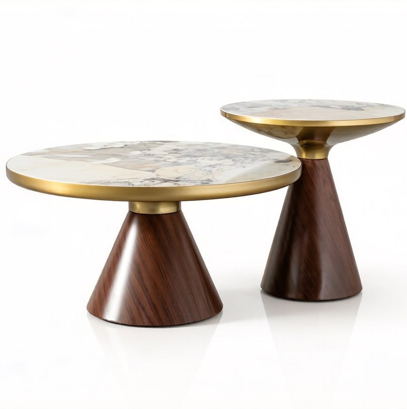 Stolik kawowy ROBIN L z drewna, spiekanego kamienia PATAGONIA i detali w szczotkowanym złocie.