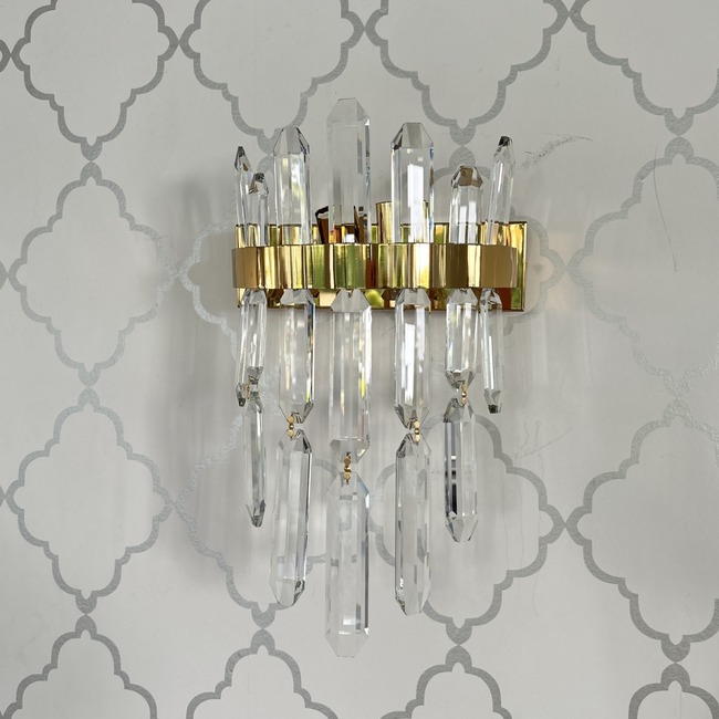 Kinkiet kryształowy BULGARI w kolorze złotym to elegancki i luksusowy dodatek do wystroju wnętrz. Jest wykonany z wysokiej jakości kryształów o różnej wielkości, które pięknie odbijają światło, tworząc efektowne refleksy na ścianach. Na środku kinkietu znajduje się dodatkowy element - złota ozdoba, która dodaje mu wyjątkowego blasku i wyrafinowania. Dzięki połączeniu złotego koloru i kryształów, kinkiet tworzy nastrojowe i magiczne oświetlenie, idealne do salonu, sypialni lub jadalni. To doskonały wybór dla osób, które pragną wprowadzić do swojego wnętrza odrobinę luksusu i elegancji.