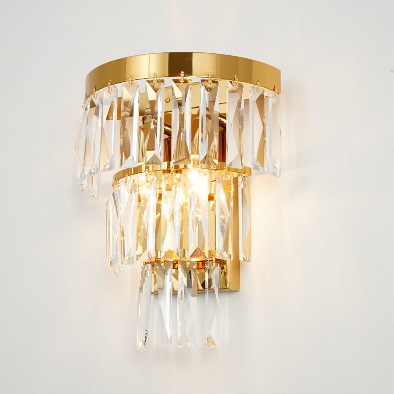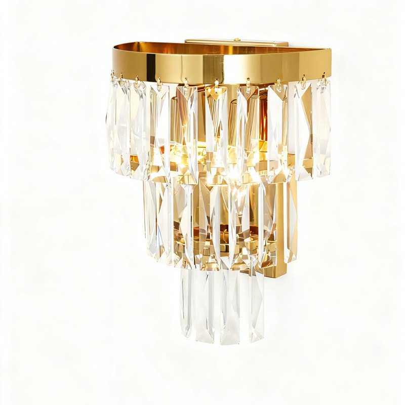 Złoty kinkiet kryształowy DIAMOND z trzema rzędami kryształów to eleganckie oświetlenie ścienne w stylu glamour, które efektownie rozprasza światło i podkreśla luksus wnętrza. Idealnie sprawdzi się w salonie, sypialni lub holu, łącząc nowoczesną formę z ponadczasowym blaskiem