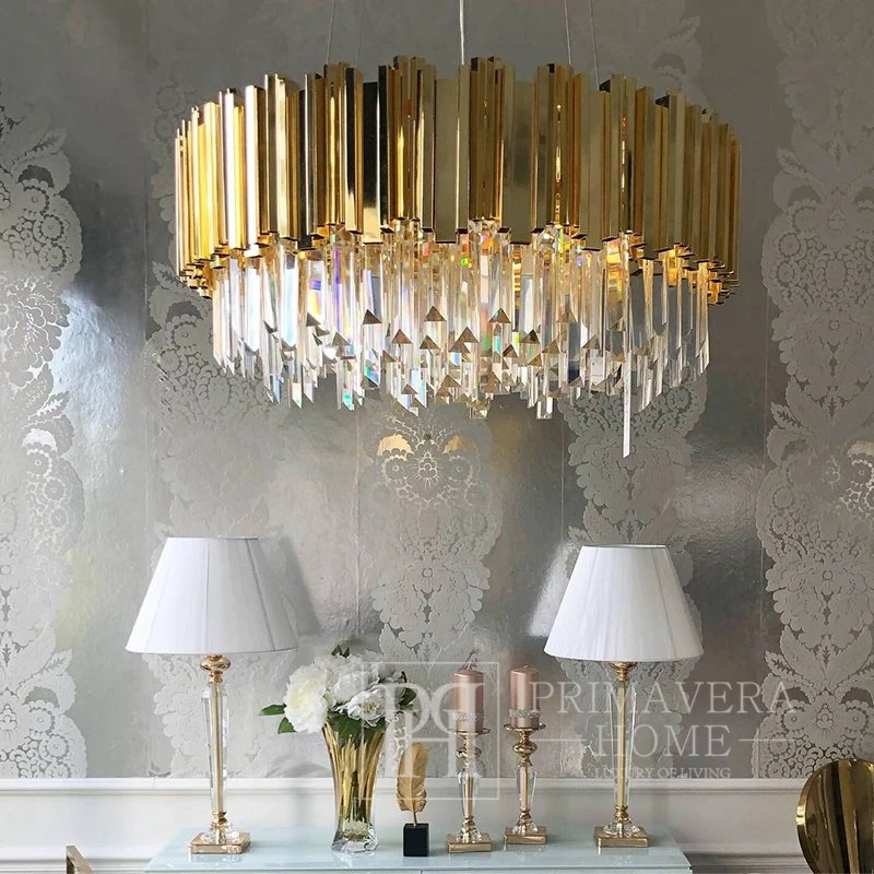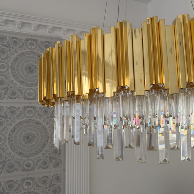 Złoty żyrandol EMPIRE GOLD to imponujący dodatek do wnętrz, który przykuje uwagę każdej osoby odwiedzającej dane pomieszczenie. Nie tylko silnie oświetla przestrzeń, ale również pięknie mieni się w dziennym świetle promieni słońca. Połączenie złota i blasku kryształów emanuje ciepłem i przyjemnymi dla oka refleksami. Żyrandol wykonany jest ze stali nierdzewnej, a jego maksymalna waga to 30 kg. Można zawiesić go na wysokości od 50 do 200 cm. Dlatego sprawdzi się świetnie zarówno w pokoju o bardzo wysokim jak i niskim suficie. Lampę nowojorską EMPIRE GOLD łatwo utrzymać w czystości, dzięki czemu może nieprzerwanie świecić olśniewającym blaskiem.