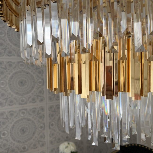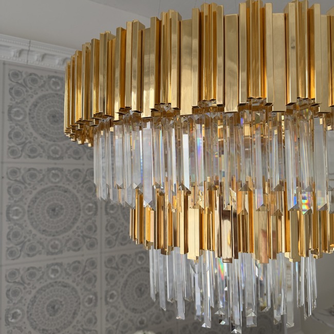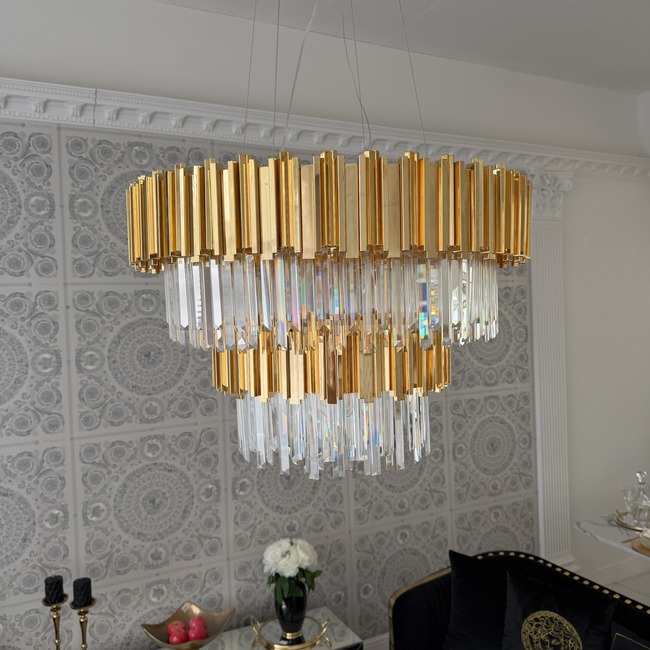 Luksusowy żyrandol EMPIRE XL w zachwycającym, złotym wariancie kolorystycznym to elegancka i niezwykle efektowna oprawa oświetleniowa, która dopełni wystrój każdego wnętrza urządzonego w wysublimowanym stylu glamour. Oryginalny, drobiazgowo przemyślany design i staranne, kunsztowne wykończenie żyrandola sprawiają, że jest on niebywałym elementem dekoracyjnym, który skutecznie uświetni każde pomieszczenie, dodając mu niewiarygodnego szyku i elegancji. Wiszący żyrandol EMPIRE GOLD zachwyca precyzją wykonania. Okrągły klosz, zawieszony na subtelnych linkach, złożony jest z czterech, rozmyślnie zaprojektowanych poziomów, które skutecznie przyciągają wzrok swoim niesamowitym blaskiem. Górny poziom wykonany został z najwyższej klasy stali nierdzewnej w pięknym, złotym kolorze. Niezwykle eleganckie, złote elementy przeplatane są kryształowymi, wspaniale mieniającymi się detalami, które będą jeszcze piękniej błyszczeć w świetle lamp, tworząc niepowtarzalny, bardzo przytulny nastrój. Połączenie klasycznego złota z gustownymi, kryształowymi elementami tworzy niesamowicie dekoracyjny efekt. Dodatkowo jest ono na tyle uniwersalne, że sprawdzi się w wielu rozmaitych aranżacjach. Żyrandol EMPIRE XL to również bardzo funkcjonalne rozwiązanie. Dzięki przemyślanym wymiarom, możliwości wygodnej regulacji wysokości i odpowiedniej mocy oświetlenia jest komfortowy w użytkowaniu i świetnie sprawdzi się w salonie lub jadalni, gdzie potrzeba dużej ilości światła. Co więcej, żyrandol jest łatwy w czyszczeniu, a do jego wykonania użyto solidnych, trwałych materiałów, dzięki czemu z pewnością posłuży na długi czas. Tak efektowny, bogato zdobiony żyrandol z sukcesem podkreśli wyjątkowy charakter każdego wnętrza.