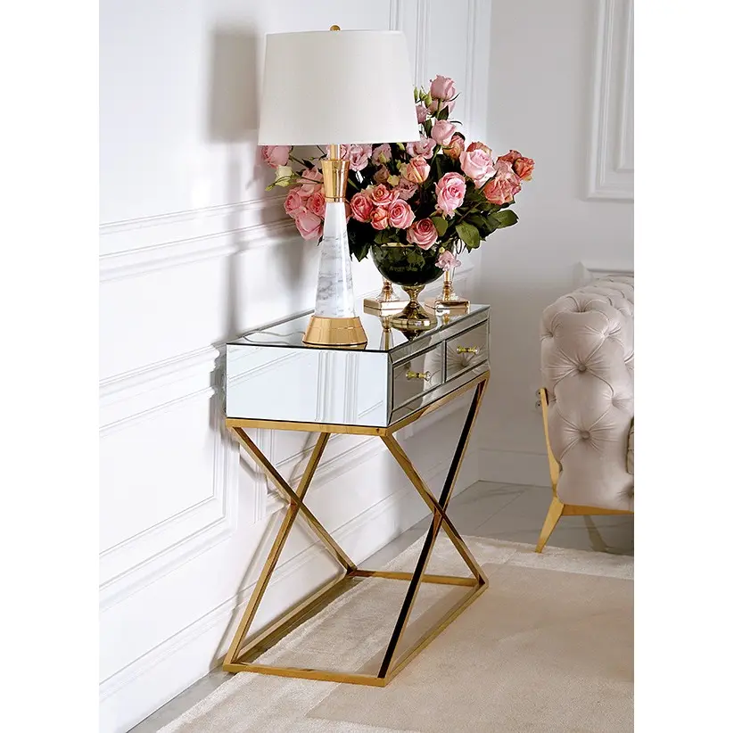 Lustrzana konsola CHIGACO GOLD w zachwycającej, złotej kolorystyce to prawdziwy synonim luksusu i elegancji. Rewelacyjnie wpisze się zarówno w tradycyjne wnętrza, jak i bardziej nowoczesne przestrzenie, urządzone w wysublimowanym, nowojorskim stylu. Sprawdzi się idealnie jako gustowny dodatek do salonu, sypialni, eleganckiego korytarza, a nawet modnego butiku. Dzięki wygodnym wymiarom (100 cm x 40 cm x 80 cm) jest meblem o wielu zastosowaniach, który bez trudu uda się zaaranżować nawet na nieco mniejszych przestrzeniach. To, co szczególnie przyciąga wzrok, to oryginalna, starannie zaprojektowana konstrukcja konsoli. Złota, subtelnie połyskująca podstawa mebla w finezyjnym i niezwykle oryginalnym kształcie nadaje mu bardzo nowoczesnego wyrazu. Dodatkowo została wykonana z najwyższej jakości stali nierdzewnej, dzięki czemu zapewnia trwałość i stabilność całej konstrukcji. Natomiast szklany, idealnie wypolerowany blat wraz z nęcąco połyskującymi szufladami z ozdobnymi uchwytami dają niezwykle elegancki efekt. Połączenie klasycznego złota z gustownym szkłem tworzy całość, obok której nie sposób przejść obojętnie.