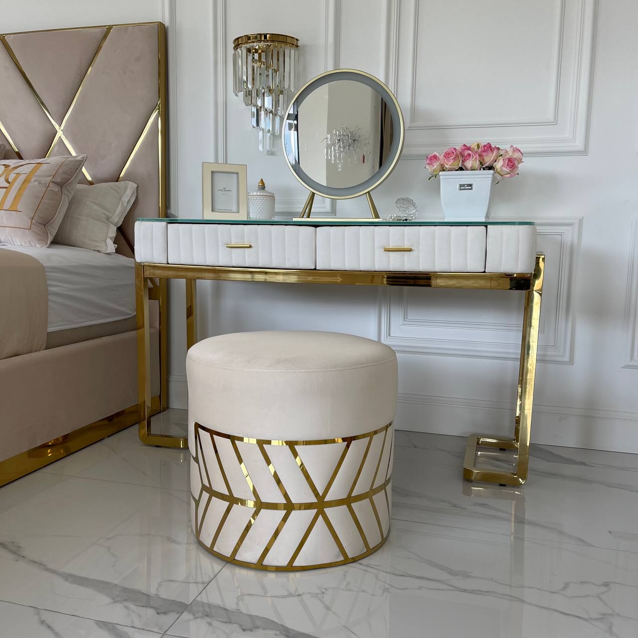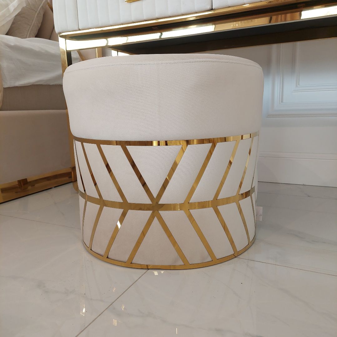 Pufa DIAMOND zachwyca harmonijnym połączeniem klasyki z nowoczesnością. Jej okrągły kształt i miękkie, komfortowe tapicerowanie wysokiej jakości tkaniną w odcieniu eleganckiego beżu gwarantują nie tylko wygodę, ale i ponadczasową estetykę. Najważniejszym elementem wyróżniającym jest jednak misterny, złoty wzór geometryczny przypominający fasetki diamentu, który nadaje pufie unikalny, biżuteryjny charakter i przyciąga wzrok.