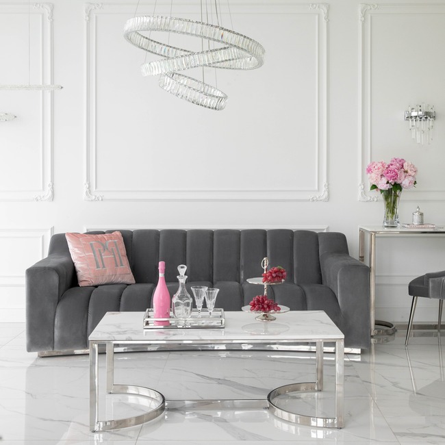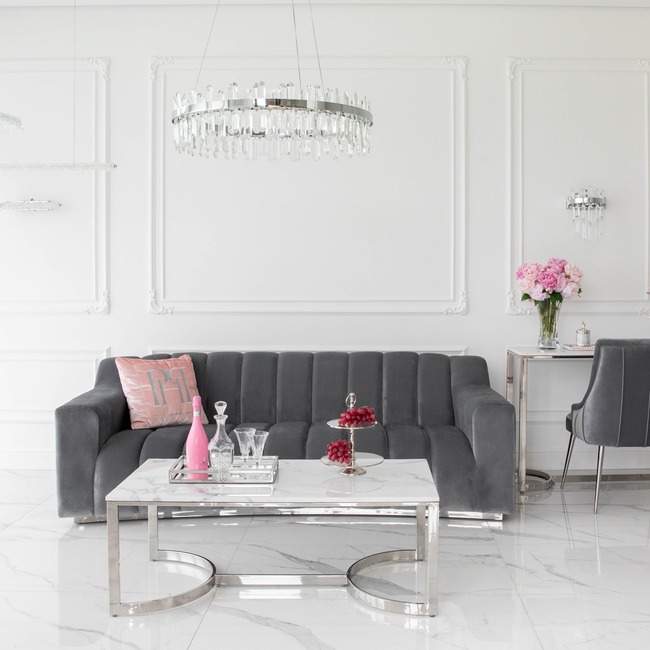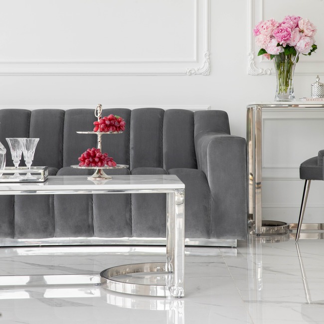 Sofa LONDON wyróżnia się prostą, a jednocześnie wyrafinowaną formą, która doskonale wpisuje się w styl modern glamour. Jej tapicerka wykonana jest z wysokiej jakości plamoodpornej tkaniny welwetowej w eleganckim szarym kolorze, co zapewnia nie tylko luksusowy wygląd i aksamitny dotyk, ale także łatwość w utrzymaniu czystości. Stabilna konstrukcja z drewna i lśniące, srebrne nogi z galwanizowanej stali nierdzewnej o wysokim połysku dodają sofie blasku i trwałości.