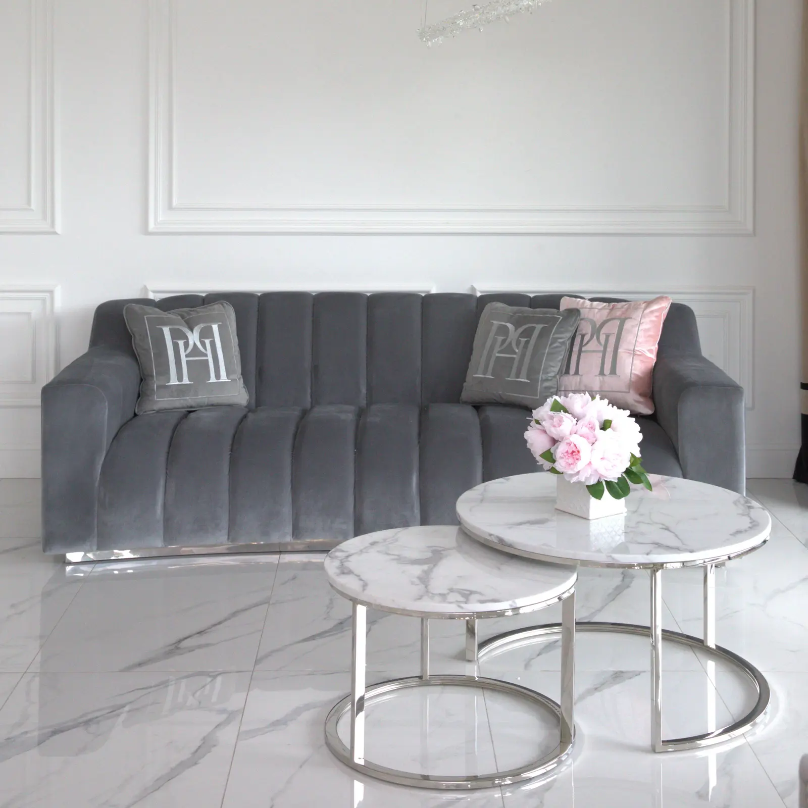 Sofa LONDON wyróżnia się prostą, a jednocześnie wyrafinowaną formą, która doskonale wpisuje się w styl modern glamour. Jej tapicerka wykonana jest z wysokiej jakości plamoodpornej tkaniny welwetowej w eleganckim szarym kolorze, co zapewnia nie tylko luksusowy wygląd i aksamitny dotyk, ale także łatwość w utrzymaniu czystości. Stabilna konstrukcja z drewna i lśniące, srebrne nogi z galwanizowanej stali nierdzewnej o wysokim połysku dodają sofie blasku i trwałości.