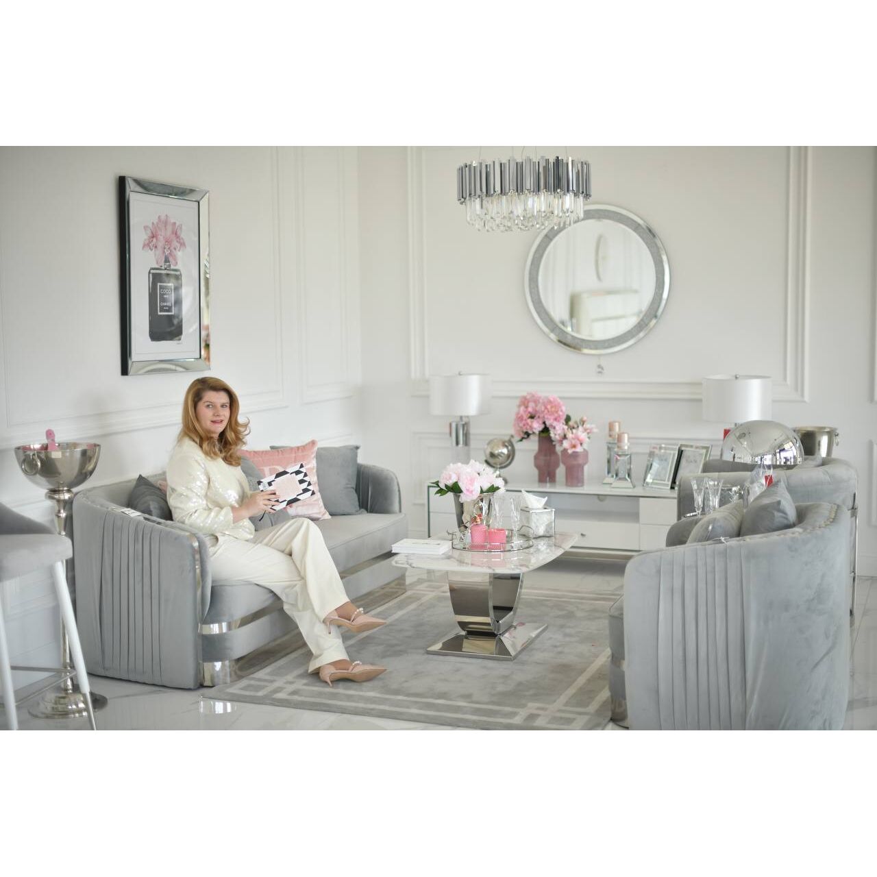 Szaro-srebrna sofa Madonna - Centrum Twojego Salonu w Stylu Glamour