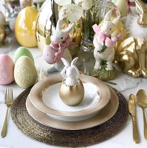 Dekoracja na stół, biały zajączek w złotym jajku, wielkanocny zając, glamour