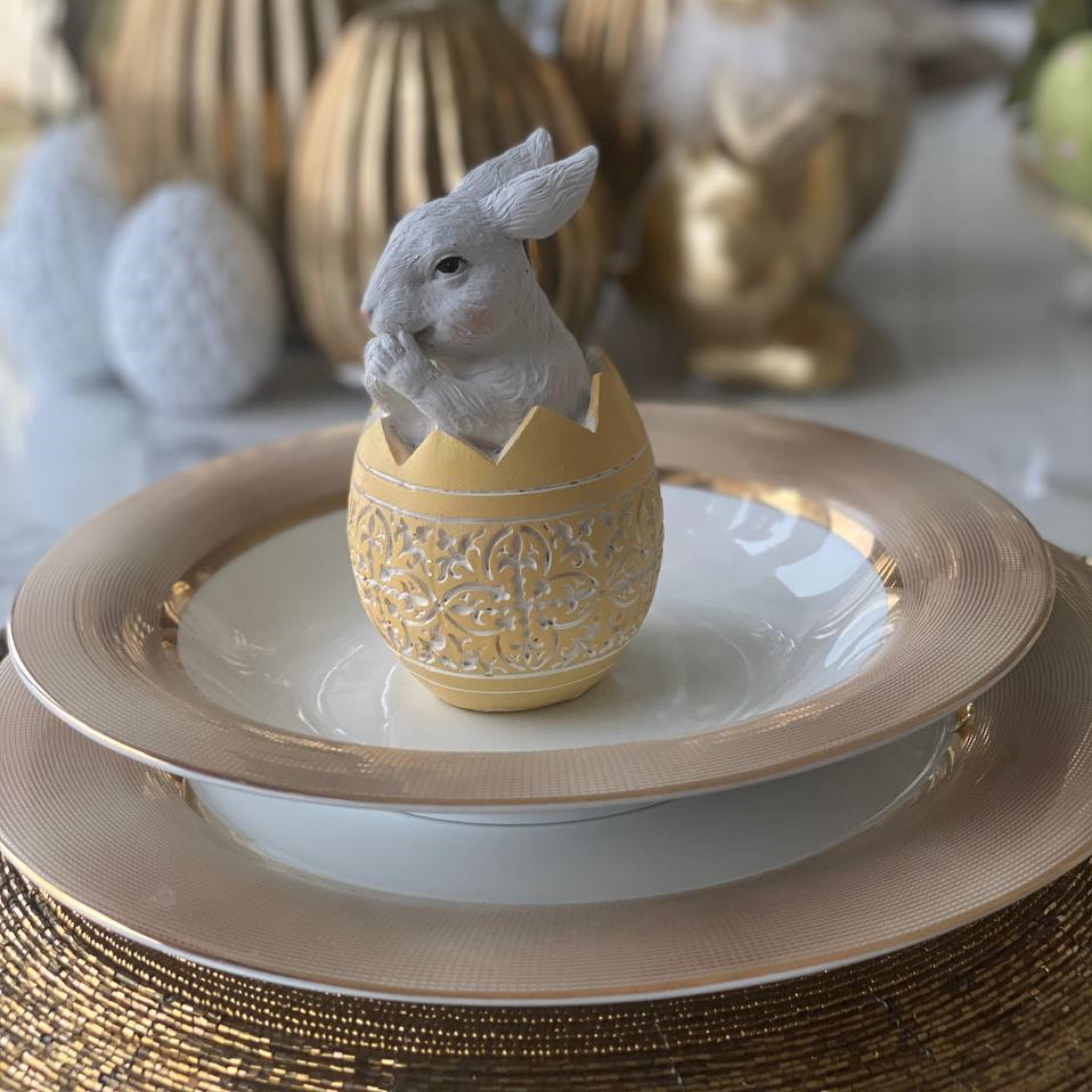 Królik biały w jajku świątecznym, dekoracja na stół, wielkanocna, biało - żółte jajko