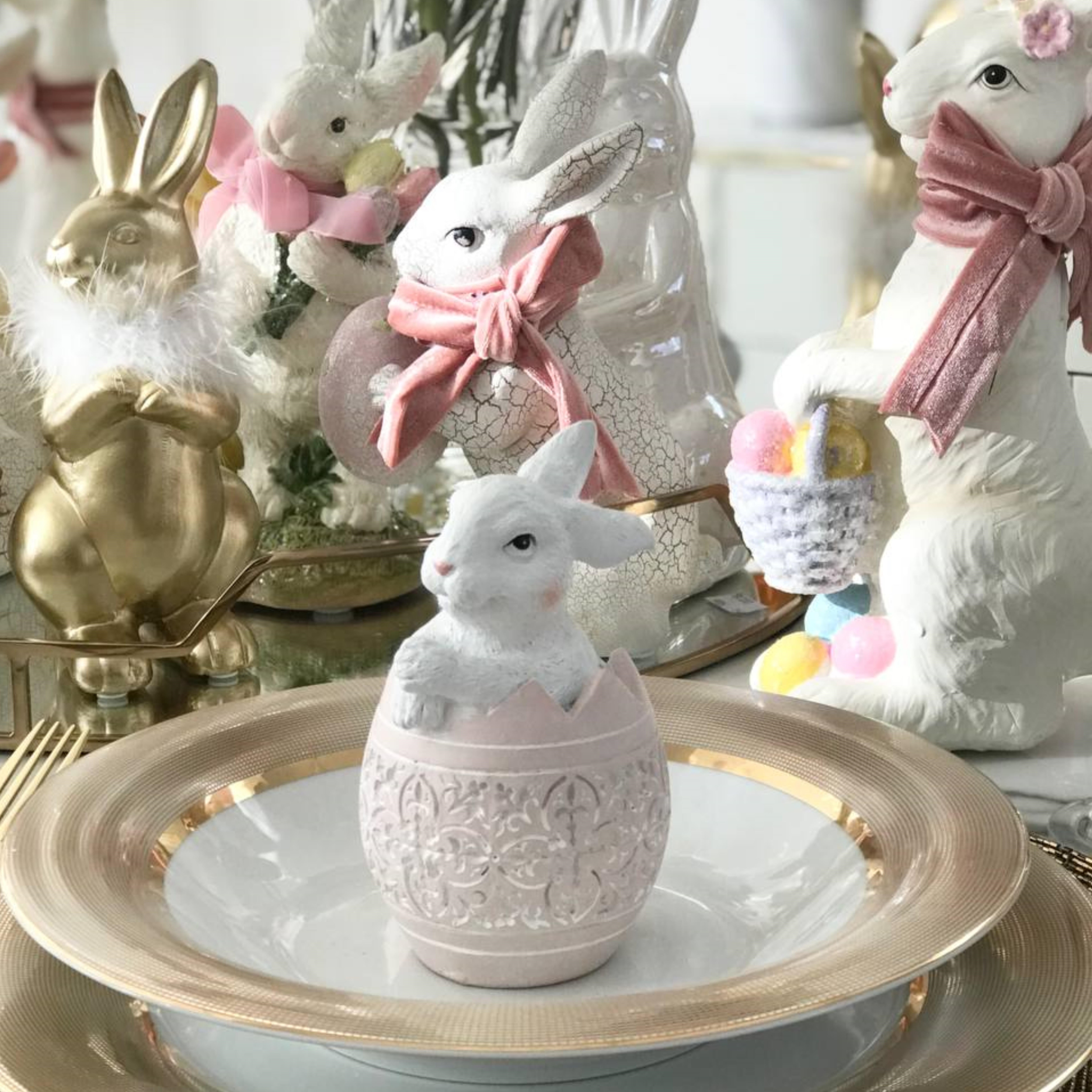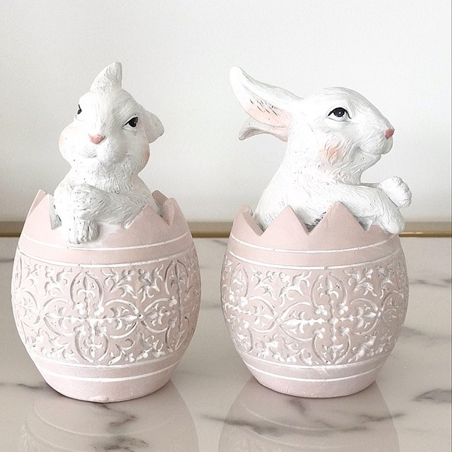 Królik biały w jajku świątecznym, dekoracja na stół, wielkanocna, różowe jajko