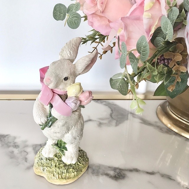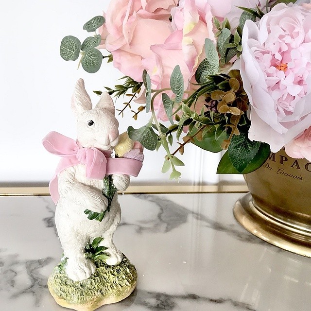 Królik wielkanocny z bukietem tulipanów, z różową kokardką, dekoracja na stół, biały, kolorowy, glamour
